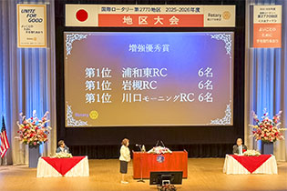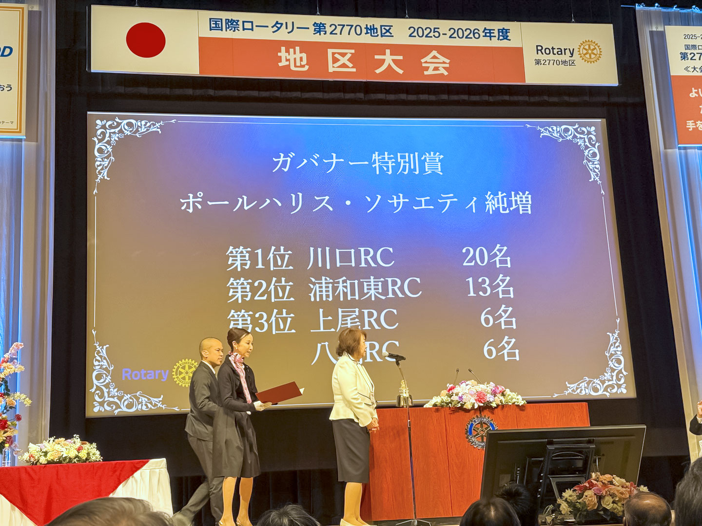 11月16日、国際ロータリー第2770地区 2025-2026年度地区大会の第2日目が戸田市文化会館大ホールで行われ、浦和東ロータリークラブは、岩槻RC及び川口モーニングRCとともに会員増強優秀クラブ賞を受賞いたしました。また、ガバナー特別賞 ポールハリス・ソサエティ純増では、13名で第2位となりました。 今後とも、私たちクラブは手を取り合って、優れた「 100 Member Club 」を目指し活動してまいります。
