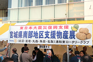 2015年10月25日,浦和駅東口パルコ前広場にてロータリーフェスタ2015が開催されました。当クラブは2ブース借り,第2520地区第8分区阿武隈ゾーンの方々に復興のPRを兼ねて物産展の出展をして頂きました。当日は天気もよく,人出も多く,また,たくさんの会員,家族も来て頂き用意した商品は全て完売しました。ご協力ありがとうございました。