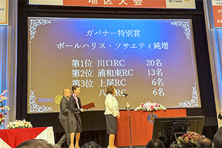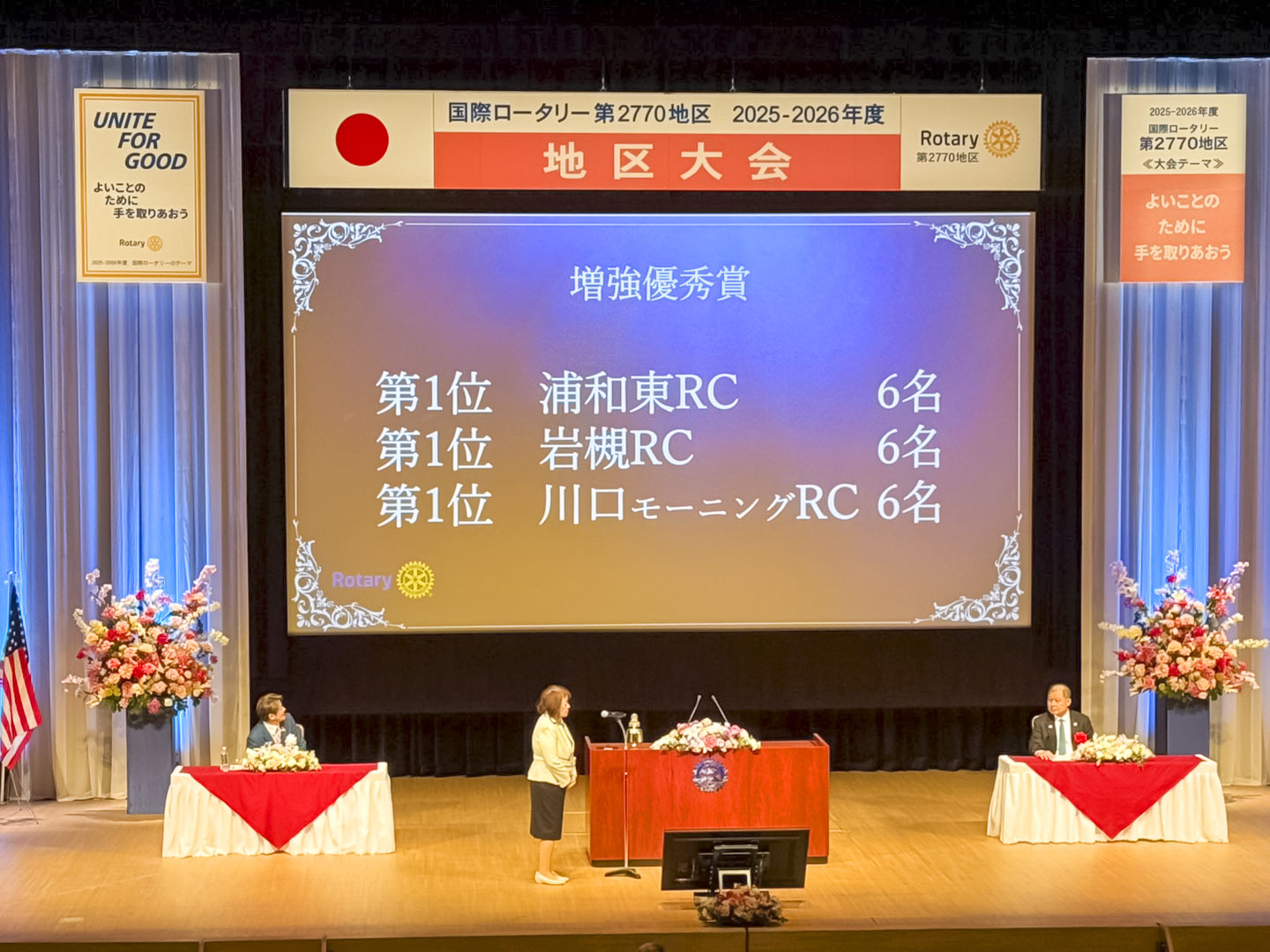 11月16日、国際ロータリー第2770地区 2025-2026年度地区大会の第2日目が戸田市文化会館大ホールで行われ、浦和東ロータリークラブは、岩槻RC及び川口モーニングRCとともに会員増強優秀クラブ賞を受賞いたしました。また、ガバナー特別賞 ポールハリス・ソサエティ純増では、13名で第2位となりました。 今後とも、私たちクラブは手を取り合って、優れた「 100 Member Club 」を目指し活動してまいります。