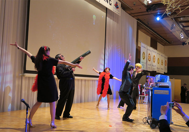 2月12日に第2770地区第1・第2グループ合同 IM( インターシティー・ミーティング )が行われました。デーブ大久保様の卓話から始まり,懇親会,各クラブ対抗のカラオケ大会と続き,当クラブからは鈴木俊治会員が代表を務め,ステージではバックダンサーとして佐藤会長らが踊りました。出演した各会員の奮闘が実り,各10クラブ中,見事優勝の栄冠に輝きました。