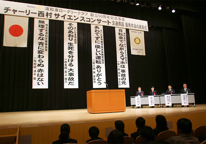令和2年2月2日,創立50周年記念事業の一環として「 交通標語受賞者表彰式 」及び「 チャーリー西村サイエンスコンサート 」を行いました。交通標語の授賞式に原山中学校の生徒と校長先生,さいたま市長や教育長,警察署長に参加していただき,式を盛大に行いました。チャーリー西村サイエンスコンサートでは,空気砲やヘリウムを使った声の変化、オペラや巨大風船による空気の重さを知る体験型の実験を行い、楽しみました。式典は大成功でした。