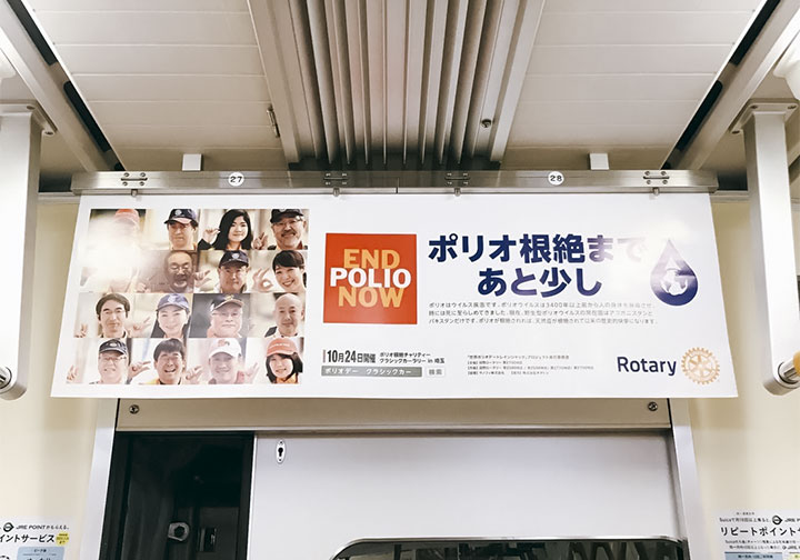 10月24日は世界ポリオデーです。さいたま市・川越市・秩父市付近にてクラシックカーによるラリー「 ポリオ根絶チャリティークラシックカーラリー 」が開催されました。他,電車内の中刷り広告を「 END POLIO NOW 」でジャックしたりしました。