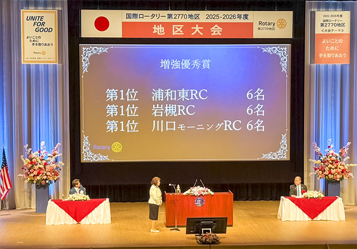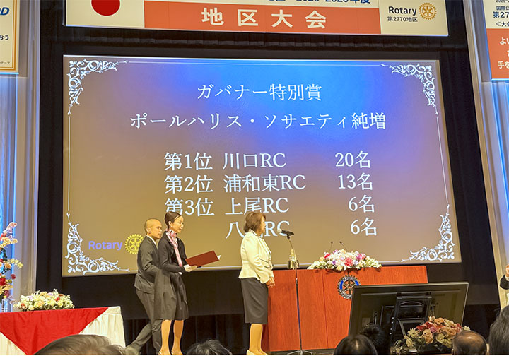 11月16日、国際ロータリー第2770地区 2025-2026年度地区大会の第2日目が戸田市文化会館大ホールで行われ、浦和東ロータリークラブは、岩槻RC及び川口モーニングRCとともに会員増強優秀クラブ賞を受賞いたしました。また、ガバナー特別賞 ポールハリス・ソサエティ純増では、13名で第2位となりました。 今後とも、私たちクラブは手を取り合って、優れた「 100 Member Club 」を目指し活動してまいります。